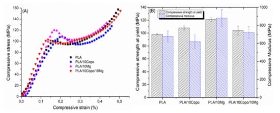 The compressive modulus and strength at yield (Figure 5B) were calculated from the stress–strain curves (Figure 5A). First, it has been noticed that all the curves showed the same behaviour and exhibit several characteristic stages. Indeed, initially, the samples show a reversible viscoelastic deformation, where stress grows linearly with strain, so the compressive moduli are determined. Subsequently, the deformation becomes irreversible, which is called the yield point [39]. Then, the stress decreases, which is recognizable by the strain softening. Finally, the stress increases again with further deformation, which is referred to the strain hardness. According to Figure 5B a decrease of 8% of the compressive modulus of PLA was noted following the addition of PEO-b-PLLA copolymer, which can be attributed to the plasticizing nature of the PEO [40]. The introduce of Mg microparticles within the PLA led to an increase of 30 % of the PLA modulus accompanied with an increase of 23 % of the compressive strength at yield, which is in accordance with the DMTA results. The PLA/10 Copo/10 Mg composite showed an increase of 16% of the compressive modulus compared to the PLA/10 Copo. This result confirms our previous discussion about the DMTA and SEM analyses (section before) that reveals the improvement of the interfacial adhesion in the presence of the copolymer.