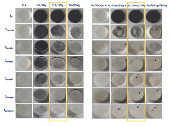 The macroscopic aspect of the processed composites and the neat PLA is presented in Figure 6 at first sight during the degradation in SBF. The neat PLA and PLA/10 Copo specimens showed a significant change of the opacity noted already after 2 weeks of immersion for the PLA/10 Copo and 6 weeks for the neat PLA. Increasing the hydrolysis time led to an increase in relative opacity for both. In this regard, previous papers were discussed the opacity modification of PLA during the hydrolysis in buffered medium [40,41]. Indeed, this change of the opacity can be explained by various phenomena such as (i) the light scattering due to the absorbed water through the material, (ii) the formation of holes and then cracks on the surface as well as in the inner part of the specimens, (iii) the degradation products formed during the hydrolysis and (iv) the increase in PLA crystallinity [42,43]. It is worth noting that the opacity is more pronounced in the presence of copolymer. Concerning the reinforced composites, a prominent change of colour is seen, i.e., gradually from grey to white colour. In fact, a white layer was formed on the specimens surfaces [25]. Its thickness was increased over time with both the addition of Mg fillers (5, 10 and 15 wt.%) and the presence of PEO-b-PLLA copolymer. According to the literature, the hydrolytic degradation is initiated when the water diffused into the matrix. Throughout the PLA, water molecule was reached the Mg surface and formed a white layer that mainly consist of magnesium hydroxide (Equation (1)) [20,26].