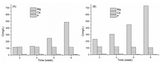 Then, Ca2+ and Mg2+reacted with HPO42− and PO43− to form small quantities of Ca3(PO4)2 and Mg3(PO4)2, respectively (Equation (4) and Equation (5)) [49,50].