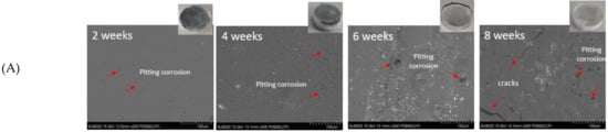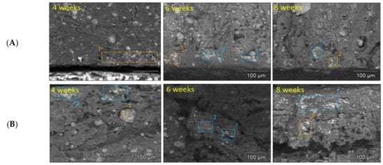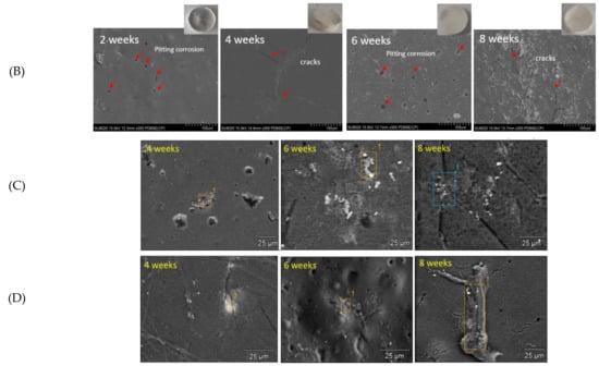 In order to assess the morphological evolution on the surface in absence of copolymer and after its incorporation in the composite, SEM was performed on samples during the degradation process (after 2, 4, 6 and 8 weeks, respectively) as shown in Figure 8A,B. The images after 10 and 12 weeks are not presented because of the manipulation difficulty due to the appearance of cracks. Indeed, according to Figure 8A some corrosion pits can be observed because of the significant degradation of Mg filler over time [45]. Jiao et al. reported a similar trend of morphology with the pure Mg [46]. After 8 weeks of immersion, a few slight cracks were appeared on the composite surface. As far as Figure 8B, the presence of pitting corrosion was more important which develop into large cracks after 4 weeks. This behaviour was expected due to the raise of degradation following the addition of the amphiphilic copolymer. Combined with EDX results (Table 2), the predominant components formed on the surface were C, O, Ca and P elements, in addition to trace of Mg. Indeed, the content of Mg was decreased gradually, in both cases, with the immersion time extension (4, 6 and 8 weeks). The degradation of Mg promotes the deposition of P and Ca which will be beneficial for new bone tissue formation during the healing process [44]. Subsequently, the Ca/P weight ratio of the degradation layer was calculated. After 8 weeks of soaking in SBF, 1.67 was reached for the PLA/10 Mg (Table 2A) versus 1.00 for the PLA/10 Copo/10 Mg (Table 2B). Thus, a layer of hydroxyapatite was formed on PLA/10 Mg surface. Its absence following the addition of copolymer could be explained by the formation of large cracks therefore the instability of the surface. For this raison, cross-sections were also analysed to identify the chemical composition in bulk as it is presented in Figure 9. Interestingly, the content of Ca and P was more prominent in the case of PLA/10 Copo/10 Mg (Figure 9B and Table 3B). Indeed, 1.67 of Ca/P ratio was reached after 8 weeks of degradation versus 1.00 for the PLA/10 Mg (Figure 9A and Table 3A).