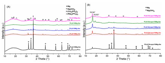 The EDX results were also supported by the XRD patterns as shown in Figure 10. The diffractogram of PLA/10 Mg in Figure 10A before the immersion time (PLA/10 Mg-0w) gave rise to the three strong reflections at 32.2°, 34.4° and 36.6°, which correspond respectively to the (100), (002) and (101) Mg planes [39] and other small reflections which also correspond to (102), (110), (103) and (112) Mg planes, respectively [23]. The domination of Mg peaks decreased over time and the components of corrosion products were formed and further identified as major Mg(OH)2 and a small number of (Ca)3(PO4)2 and (Mg)3(PO4)2. According to the literature, (Ca, Mg)3(PO4)2 has similar chemical compositions as the nature bone which could induce good biocompatibility and osteoconductivity [47,48]. During the degradation process, H2PO4− dissolved in the SBF bath and reacted with OH− from Equation (1) to produced HPO42− and PO43− respectively (Equation (2) and Equation (3)).