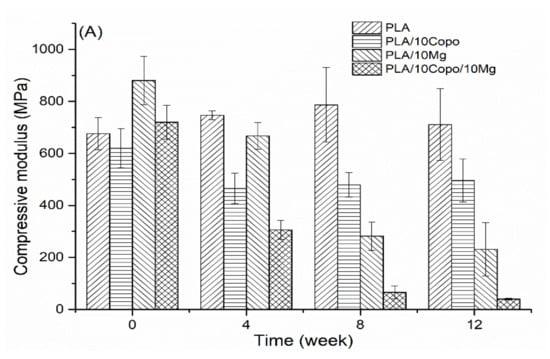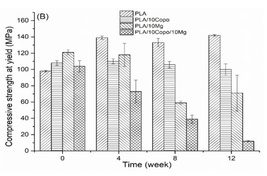Compression test was performed every 4 weeks on PLA, PLA/10 Copo, PLA/10 Mg and PLA/10 Copo/10 Mg during the degradation process. The compressive moduli (Figure 11A) and strength at yield (Figure 11B) were calculated from the stress–strain curves. After one month of degradation, all the mechanical performances were decreased. Thereafter, the loss became grater, except the pure PLA which maintained its mechanical properties during the whole test. This behaviour could be explained by the increase of the crystallinity over time especially with the slight decrease in the molecular weight and the mass variation compared with the other samples (Figure S1A–C). Regarding the PLA/10 Mg, this implant meets the compressive strength of natural cortical bone during the first 4 weeks. According to the literature, this value is between 100 and 230 MPa [53,54,55]. On the other hand, the compressive Moduli of all the materials until the 8th week are within the range of cancellous bone (50–800 MPa) [56]. This behaviour has already been highlighted in the literature by Ali et al. [20]. Mg content of 10 wt.% improves the initial mechanical properties of PLA which was proved by Cifuentes work [25]. However, it impairs both compressive modulus and strength at yield during the degradation process, which is further accelerated with the presence of the amphiphilic PEO-b-PLLA copolymer. Indeed, the decrease in the mechanical performances with the in vitro degradation time can be explained by the hydrolysis of PLA and also the corrosion of Mg filler which forms a Mg(OH)2 layer, which leads to a rise of hydrolysis at PLA/Mg interface. Therefore, there is a deterioration of the adhesion between the matrix and the filler. The copolymer enhances this behaviour as it facilitates the diffusion of water in the composites over time.