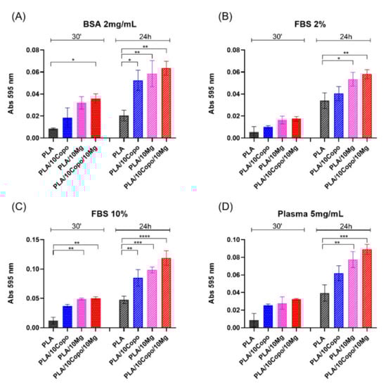 First, we evaluated the protein-binding capability of different polymer film used. This information is necessary for guaranteeing the interaction of the cellular proteins with the film surface. The capability of PLA-based films to bind proteins was measured trough the protein adsorption assay (Figure 12). We assessed the adsorption of BSA (2 mg/mL), FBS 2%, FBS 10% and plasma (5 mg/mL), on each film at two different incubation times, 30 min and 24 h, according to our protocol [57,58]. We found an increase of the adsorption capability in PLA-derivative films compared to neat PLA film. The increase was measured for all proteins and was in the order PLA/10 Copo/10 Mg > PLA/10 Mg > PLA/10 Copo > PLA film (Figure 12). This behaviour was observable after 30 min of incubation and was further increased after 24 h of incubation. Of note, the highest increase in the adsorption capability of PLA-based films for FBS 10% and plasma (>FBS 2% and >BSA) was due to the highest protein concentration in these samples (Figure 12). The results suggested that the incorporation of the amphiphilic diblock copolymer (PEO-b-PLLA) increased the capacity of polymer films to bind different kinds of proteins thanks to its hydrophilicity. This behaviour is in agreement with the aforementioned WCA measurements.