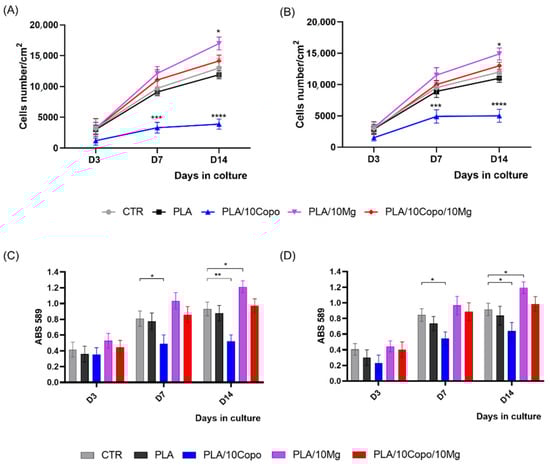 Results reported in Figure 13C,D showed a comparable dehydrogenase activity in both types of MSCs on PLA and PLA/10 Copo/10 Mg compared to CTR at each time point confirming the proliferation rate (Figure 13A,B). Moreover, according to the growth curve, we found a significant increase of the enzymatic activity on PLA/10 Mg compared to CTR at D14, and a high reduction at D7 and D14 in both stem cells on PLA/10 Copo respect to CTR (Figure 13C,D).