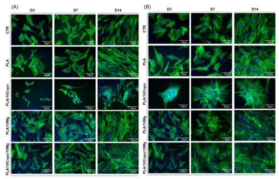 Morphology of (A) hBM-MSCs and (B) hASCs on PLA, PLA/10 Copo, PLA/10 Mg and PLA/10 Copo/10 Mg during the time in culture (D3, D7 and D14). Representative images of F-Actin (Phalloidin-Alexa-fluor-488) and nuclei (DAPI, blue) on PLA-based films and on control. Scale bar = 50 μm.