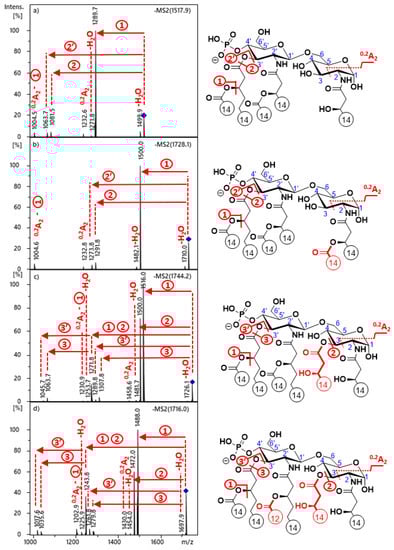 The loss of the C-3’ linked C14:0(3-O-C14:0) acyloxyacyl chain, both as a ketene or an acid (Δm = 436 or 454 u), gave rise to peak pairs, detected with very low intensities for all precursor ions (at m/z 1082/1064, m/z 1292/1274, m/z 1308/1290, and m/z 1280/1262 in Figure 1a–d, respectively). Water losses (Δm = 18 u) were detected with low intensities, both from the precursors and some acyl loss fragment ions. It should also be noted that neither the release of the C-2 secondary fatty acid nor releases of the amide-linked primary fatty acids were observed. Although, these were not surprising because losses of those substituents are usually less preferential at the MS2 stage [18,23].