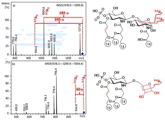 For the 3-acyl standards, another peak with moderate intensity appeared (at m/z 1272 and 1244 in Figure 1c,d, respectively), which derived from the combined losses of the C-3’ secondary and C-3 primary fatty acids (Δm = 472 u). From this latter fragment, further loss of a C14:1, as a ketene or an acid (Δm = 208 or 226 u, respectively) from the C-3’ primary position, resulted in pairs of low-intensity fragment ions (at m/z 1064 and m/z 1046 in Figure 1c and m/z 1036 and m/z 1018 in Figure 1d).