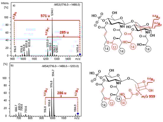 ESI-ion trap mass spectra obtained at MS3 and MS4 stages of selected ions at (a) m/z 1488 and (b) m/z 1203 for PHAD-504, demonstrating the structural relationship between 0,2A2 and 0,4A2 cross-ring fragment ions in 3-acyl lipid A.