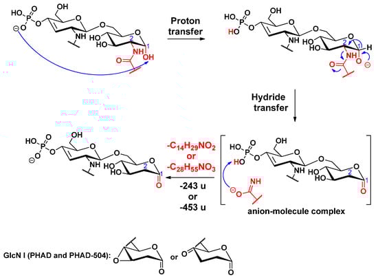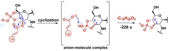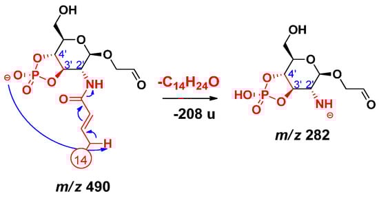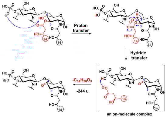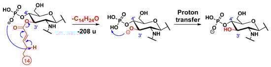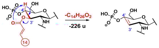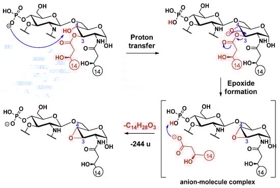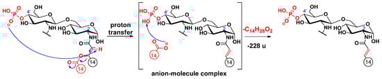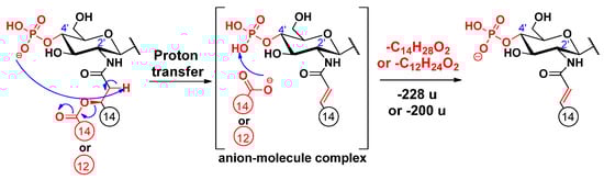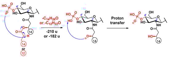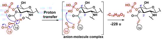 An alternative elimination mechanism of the C-3’ oxyacyl group (as free fatty acid), adjacent to the phosphate group, has already been explained by Madalinski et al. [16] using a charge-driven dissociation via the formation of an anion–molecule complex (Scheme 1). Namely, the phosphate group (basic site) removes a proton from the α-position (acidic site) of the primary fatty acyl chain linked at the C-3’ position, then an α–β elimination is followed by the formation of an intermediate anion–molecule complex.