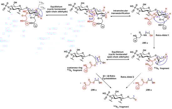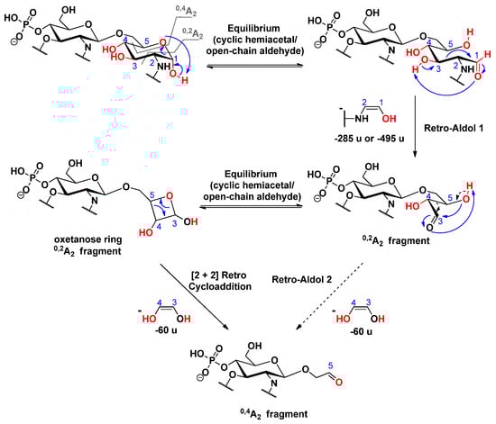 Generally, 0,2A2 and 0,4A2 cross-ring fragments are simultaneously detected in the MS2 mass spectra of 4’-monophosphoryl lipid A species, in which the C-1 position is free [25]. Thus, it can be assumed that the first step in the mechanism of A-type cross-ring cleavages involves ring-opening [30] of the reducing sugar, in order to produce an equilibrium amount of the open-chain aldehyde, which is then capable of acting as a reducing agent. Consequently, this form can undergo a retro-aldol reaction [31], in order to yield a shorter chain of α,β-dihydroxy aldehyde (i.e., 0,2A2 fragment) via the neutral loss of the anchored enol (Scheme 12). For the further decomposition of the 0,2A2 product ion, we suggested two pathways: (i) either a second retro-aldol reaction takes place and leads directly to the 0,4A2 fragment ion by loss of an ethane-1,2-diol (Δm = 60 u); or (ii) the hydroxyl group attached to C-5 reacts with the formed aldehyde, which, by a second hemiacetal-aldehyde equilibrium, forms a four-membered ring, so-called oxetanose [32], which can undergo a [2 + 2] retrocycloaddition reaction [33] (Scheme 12). The predominance of the oxetanose derivative is also supported by the study of Lee et al. [34], in which they showed via synthesis of diacylglycerol analogs that a four-membered ring (oxetanose) was obtained in equilibrium, with its corresponding open-chain form (nonoxetanose) at a ratio of 5:1.