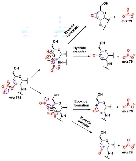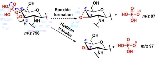 By comparing the MS2 mass spectra related to different collision energies in Figure S2, it could be seen that as the collision energy increased, the relative intensity of the peaks at m/z 796 and 778 decreased, while that of the peaks at m/z 79 and 97 increased. The peaks at m/z 796 and 778 each correspond to an 0,2A2 fragment, which had lost the C-3’ acyloxyacyl group either as a ketene or an acid, respectively. The formation of dihydrogen phosphate ion (H2PO4−, m/z 97) was considered from the fragment at m/z 796, by two possible pathways (Scheme 14). In the first way, an epoxidation takes place (involving the antiperiplanar relationships between the formed oxide ion at C-3’ and the phosphate group), which will then easily promote the removal of the H2PO4 that will hold the negative charge. In the second way, a hydride transfer takes place, leading to the formation of the H2PO4− ion. The formation of monometaphosphate ion (PO3−, m/z 79) was considered from the fragment at m/z 778, by two pathways, starting from the cyclic phosphate derivative (Scheme 15), from which the monometaphosphate ion could be considered as a good leaving group, either following a hydride transfer or an epoxide formation. However, the pathway starting from the non-cyclic phosphate derivative (Scheme 16) was not considered, as in that case, the PO3− would be formed via the removal of a proton from the detached neutral metaphosphoric acid (HPO3), which would lead to detection of the intermediate fragmentation product, i.e., the negatively charged lipid A, without the C-4’ phosphate group; albeit, such a phosphate-free product ion (m/z 698) was not seen in the MSn mass spectra.