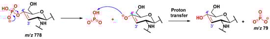 Two signals, at m/z 79 and 97, corresponding to the monometaphosphate (PO3−) and dihydrogen phosphate (H2PO4−) ions, respectively, were observed in the MS2 mass spectra from QqQ of the four lipid A precursor ions (an example for 3D-PHAD is shown in Figure S2). As both fragment ions were related to the C-4’ phosphate moiety, we took mechanisms leading to their formation under investigation. In the literature, the mechanism of dephosphorylation reaction of lipid A under acidic conditions has only been proposed for the anomeric phosphate group (at position C-1) [16].