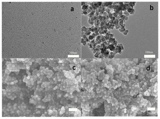 A transmission electron microscope (TEM) was used to determine the morphology of CdTe QDs, MIP@SiO2@QDs and NIP@SiO2@QDs. As shown in Figure 2a, the well-dispersed CdTe QDs with an average size of 3 nm basically appeared regularly spherical. As we can see in Figure 2b, the particle size of MIP@SiO2@QDs was significantly increased to 40~60 nm. The corresponding SEM images of MIP@SiO2@QDs and NIP@SiO2@QDs are presented in Figure 2c,d. Both of these, in the particle size range of 40~60 nm, are fairly uniformly spherical.