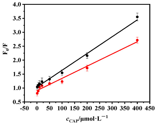 Figure 9 shows the Stern-Volmer plots from MIP@SiO2@QDs and NIP@SiO2@QDs with CAP. For MIP@SiO2@QDs, F0/F showed a good linear relationship with the concentration of CAP in the range of 1.00~4.00 × 102 μmol·L−1. The linear equation was F0/F = 0.0061c + 1.027 (R2 = 0.9973) and the limit of detection (LOD) was 0.35 μmol·L−1 (3σ, n = 9). For NIP@SiO2@QDs, the correlation coefficient was 0.9820 and the linear regression equation was F0/F = 0.0044c + 0.9095. It is obvious that MIP@SiO2@QDs performed a more obvious response to CAP than NIP@SiO2@QDs due to its fluorescence quenching amount being more apparent.