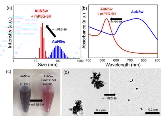 Characterization of AuNSw before and after the addition of mPEG-SH: (a) Size distribution of AuNSw measured by DLS changed from 156.50 ± 15.36 nm to 18.32 ± 11.25 nm after the addition of mPEG-SH; (b) The SPR peak of AuNSw shifted from 800 nm to 531 nm in PBS after the addition of mPEG-SH; (c) The color of AuNSw in PBS turned from dark purple to red after the addition of mPEG-SH; (d) TEM images illustrated AuNSw (left) without mPEG-SH and dispersed sGNPs after the addition of mPEG-SH (right).