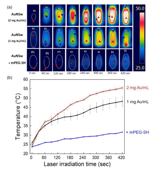 We investigated the photothermal effect of AuNSw. Real-time thermographic camera and temperature measurement exhibited the temperature rise by AuNSw upon the irradiation of continuous-wave (CW) laser with the wavelength of 808 nm and power of 1 W/cm2 (Figure 2). The temperature increased to 55.5 °C within seven minutes of CW laser irradiation if the concentration of AuNSw was 2 mg Au/mL. If the concentration of AuNSw decreased, the rate of temperature changes also dropped, resulting in a saturated temperature at 48.2 °C. However, AuNSw was not able to generate heat upon CW laser irradiation when the particle structure was disturbed by mPEG-SH, and was unable to absorb the laser.
