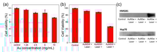 Cytotoxicity and therapeutic effect of AuNSw with CW laser irradiation: (a) Cytotoxicity of AuNSw among CT26 cancer cells after cellular uptake (12 h) with different AuNSw concentrations; (b) Cell viability showed the therapeutic effect of AuNSw (2.5 mg Au/mL) combined with CW laser irradiation (808 nm, 1 W/cm2, 10 min). Other groups did not exhibit toxic effects. Cellular uptake time was 12 h; (c) The expression of HMGB1 and Hsp70 was analyzed through western blot with samples obtained at 24 h after treatment.