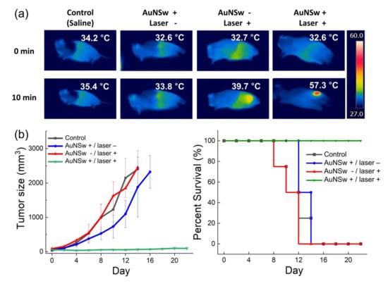 We investigated the therapeutic effect against cancer after each group was treated differently. Tumor size did not increase for 22 days if the tumor was treated with both AuNSw and laser irradiation (Figure 4b, left). However, the tumor volume of the other three groups increased rapidly within 15 days until it reached 2000 mm3 (Figure S1, see Supplementary Materials). Data on survival rate demonstrated the same results (Figure 4b, right). The survival rate of the mice treated with both AuNSw and laser irradiation was 100% during the observation period. In contrast, mice from the other three groups failed to survive more than 15 days.