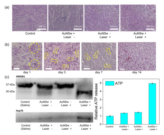 Histological and biochemical analysis of tumor tissues after the treatment: (a) Histological analysis was performed with tumor tissue samples, excised on 14 days after various treatments; (b) Histological images of tumors were obtained on 1, 3, 7, and 14 days after intratumoral injection of AuNSw. The silver staining emphasizes the location of gold nanoparticles (yellow circle or arrows); (c) Western blot analysis displayed the expression of HMGB1 and Hsp70 from tumor tissue after PTT (left). The level of ATP expression, measured with an ATP assay kit, increased after PTT (right).