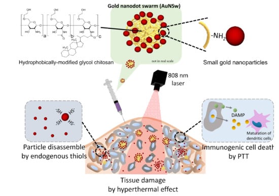 Here, we developed a novel PTT agent with a core-shell structure, composed of glycol chitosan (core) and small gold nanoparticles (shell), called a gold nanodot swarm (AuNSw) (Scheme 1). After hydrophobically-modified glycol chitosan formed particles (GCPs) in an aqueous solution, small gold nanoparticles (sGNPs) with a diameter of less than 20 nm assembled on the GCPs via the interaction between Au and amine functional groups of glycol chitosan. AuNSw generates heat upon NIR laser irradiation, as the absorption of gold aggregates shifts to the NIR region via the plasmon coupling effect [12,13]. This hyperthermal effect of AuNSw