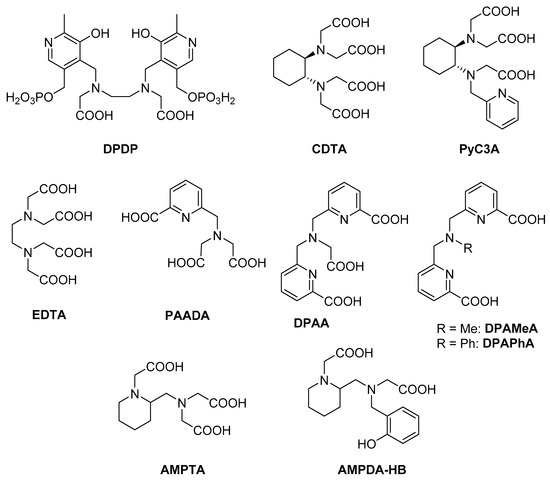 Mn2+ is an endogenous metal ion that is involved in several biochemical processes and it is present in serum at concentrations of 0.5–1.2 µg/L [1]. Thus, living organisms can efficiently deal with small excess amounts of free metal ions in organs and tissues. Its relative toxicity (LD50 = 0.22 mmol/kg) [1] has made it attractive in the last decade as a replacement for gadolinium in contrast agents for magnetic resonance imaging (MRI) since Gd(III) is also toxic in its free form, even in very low amounts, and can be associated with a pathology called nephrogenic systemic fibrosis, which affects patients with compromised renal functionality [2]. Manganese(II) represents a valid alternative to gadolinium(III) in MRI applications because it has a high paramagnetism due to its five unpaired electrons; moreover, it is endowed with a long electronic relaxation time and it can coordinate easily exchangeable water molecules [3,4,5,6,7]. As with Gd(III)-based MRI contrast agents, the relatively high concentrations of Mn(II) that are needed for MRI applications (0.05–0.30 mmol kg–1) require the cation to be “caged” by an organic ligand to prevent undesired side reactions in vivo that would compromise its role and cause toxic effects. Such chelators are normally polyamino-polycarboxylates that are capable of strongly binding the metal ion while leaving at least one free coordination position for an exchangeable water molecule: this is an almost compulsory requirement for having a significant contrast enhancement effect with this type of MRI agent. In particular, since Mn(II) typically forms six- or seven-coordinated complexes, using hexa- or pentadentate chelators (Figure 1) was proposed to match the good stability with the presence of at least one binding site available for H2O. The only Mn-based MRI contrast agent that was approved for clinical use was Teslascan®, where the metal ion is caged by a DPDP (dipyridoxyl diphosphate) ligand (Figure 1) [8]. However, such an agent was recently withdrawn by both the European and US markets because of poor clinical performance and toxicity concerns. Since then, several alternatives have been reported, among which, the Mn-complexes of cis-1,4-DO2A and its derivatives (1,4-DO2A = 1,4,7,10-tetraazacyclododecane-1,4-diacetic acid) [9,10], PC2A derivatives (PC2A = tetraazabicyclo[9.3.1]pentadeca-1(15),11,13-triene-3,9-triacetic acid) [11,12], trans-CDTA (trans-1,2-diaminocyclohexane-N,N,N′,N′-tetraacetic acid, Figure 1) [13] and PyC3A (N-picolyl-N,N′,N′-trans-1,2-cyclohexylenediaminetriacetate, Figure 1) [14] seem to be the most promising for general MRI applications.