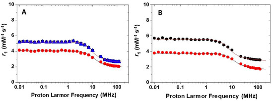 ) for (A) [Mn(AMPTA)]− and (B) [Mn(AMPDA-HB)]−. The blue triangles represent the 1H NMRD profile at 298 K of enantiomerically pure [Mn((R)-AMPTA)]−. The lines represent the fit of the data, as explained in the text.