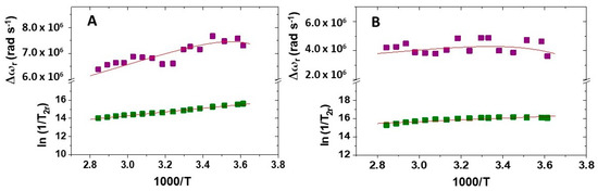 Reduced transverse 17O NMR relaxation rates and chemical shifts versus reciprocal temperature measured for (A) [Mn(AMPTA)]− and (B) [Mn(AMPDA-HB)]− at 11.74 T. The lines represent the fit of the data, as explained in the text.