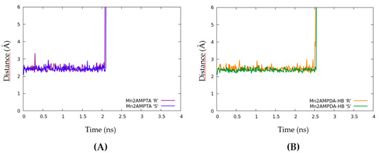 Time evolution of the distance between Mn2+ ion and the coordinated water molecule for (A) [Mn((R/S)-AMPTA)·(H2O)]− and (B) [Mn((R/S)-AMPDA-HB·(H2O)]−.
