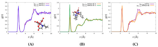 Radial distribution function of water oxygen relative to Mn(II). (A): [Mn((R/S)-AMPTA)·(H2O)]−; (B) [Mn((R/S)-AMPDA-HB·(H2O)]−; (C) comparison of g(Ow–Mn) for the R-enantiomer of both complexes.