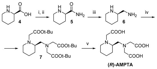 The R-enantiomer of AMPTA was also prepared (Scheme 2), starting from D-pipecolinic acid ((R)-piperidine-2-carboxylic acid, 4) via amide 5, which was obtained according to a reported procedure [24], and was, in turn, reduced to amine 6 with LiAlH4. Exhaustive alkylation with tert-butyl bromoacetate (7), followed by deprotection of the carboxylates under acidic conditions (TFA), led to the intended ligand, whose ESI MS and NMR characterization data were identical to what was reported for the racemic analogs, as expected.