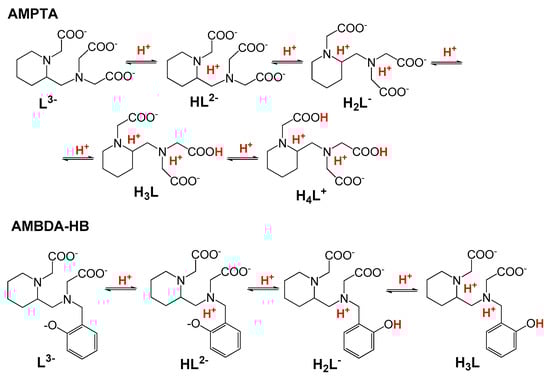 The protonation constants of H3AMPTA and H2AMPDA-HB, defined by Equation (1), were determined using pH potentiometry, 1H-NMR spectroscopy and UV-vis spectrophotometry. The logKiH values of H3AMPTA and H2AMPDA-HB are listed in Table 1 and compared with those of pentadentate H2DPAMeA and H2DPAPhA ligands (Figure 1).