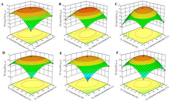 3D plot for interactions between independent variables on extraction of total phenolic (TP, in mg GAE/g dw, A–C) and flavonoid content (TP, in mg QE/g dw, D–F).