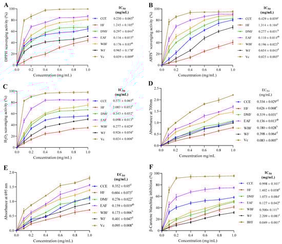 As shown in Figure 2B, the scavenging curve of CEE/fractions on ABTS•+ exhibited an upward trend as the concentration increased. At 1 mg/mL, the scavenging rates of CEE, HF, DMF, WBF, EAF, WF, and VC were 80.31, 40.54, 88.76, 90.11, 82.97, 67.36, and 94.90%, respectively. Among all fractions, the minimum IC50 value was showed by EAF (0.110 ± 0.014 mg/mL) proceeded by DMF (0.196 ± 0.023 mg/mL), WBF (0.277 ± 0.031 mg/mL), CEE (0.429 ± 0.039 mg/mL), and WF (0.654 ± 0.043 mg/mL), whereas HF displayed the highest IC50 value (1.314 ± 0.104 mg/mL). Collectively, this finding was in agreement with that of Kaewseejan and Siriamornpun []. Comparison with the inhibitory capacity of VC (0.025 ± 0.005 mg/mL) showed that the scavenging activity of CEE and its fractions was slightly weak.