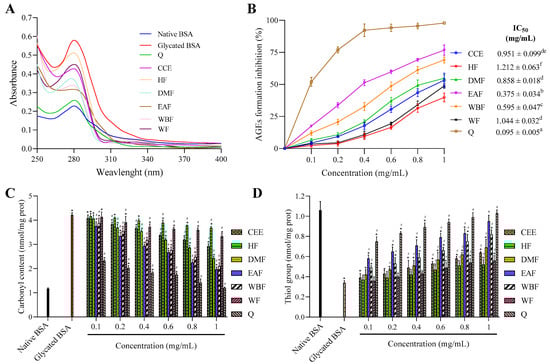 The effect of CEE and its fractions from E. fragilis extract on the (A) UV–vis absorption spectrum, (B) AGEs formation, (C) carbonyl content, and (D) the level of thiol group in glucose-glycated BSA. All values are expressed as means ± SD, n = 3. Means without a common superscript letter differ (p < 0.05), as analyzed by one-way ANOVA. In the same graph, bars with * represent significantly different from native BSA at p < 0.05 and bars with # represent significantly different from glycated BSA at p < 0.05.