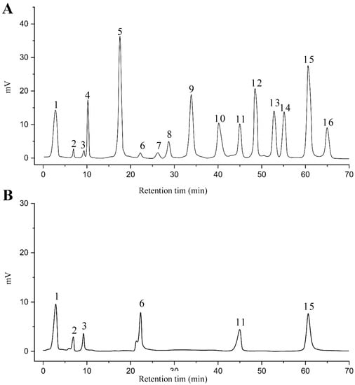 HPLC chromatogram of (A) 16 available polyphenol standards and (B) EAF from E. fragilis. Peak numbers correspond to chemical compounds gallic acid (retention time (Rt) = 2.76 min, peak 1), vanillic acid (Rt = 6.94 min, peak 2), caffeic acid (Rt = 9.34 min, peak 3), syringic acid (Rt = 10.23 min, peak 4), catechin (Rt = 17.52 min, peak 5), ferulic acid (Rt = 22.28 min, peak 6), p-coumaric acid (Rt = 26.23 min, peak 7), sinapic acid (Rt = 28.67 min, peak 8), chlorogenic acid (Rt = 33.81 min, peak 9), isoquercitrin (Rt = 40.06 min, peak 10), rutin (Rt = 44.95 min, peak 11), quercetol (Rt = 48.43 min, peak 12), luteolin (Rt = 52.76 min, peak 13), kaempferol (Rt = 55.11 min, peak 14), quercetin (Rt = 60.51 min, peak 15), and apigenin (Rt = 64.94 min, peak 16).