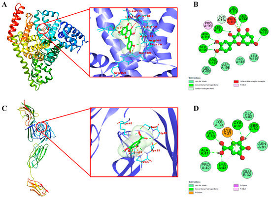 The 3D view of the binding mode between quercetin (A) and gallic acid (C) with BSA and RAGE, respectively. The 2D detailed view showed the interaction between quercetin (B) and gallic acid (D) with neighboring residues of BSA and RAGE, respectively.