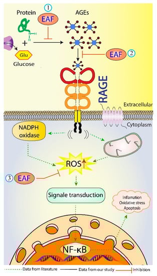 The continuous exposure to aggressors from various sources may lead to a rise in free radicals production in the human body, exceeding its capacity to regulate them, and, over time, contributes to the development of several oxidative stress-associated diseases including ageing and diabetes []. Hence, antioxidants supplementation can help to maintain an optimal biological system by removing excessive concentrations of free radicals []. It has been demonstrated that free radicals participate in the glycation process. Glycation, a spontaneous nonenzymatic reaction between available amino groups of amino acid residues in proteins and reducing sugars, occurs to a higher extent under aging and hyperglycemia, resulting in advanced glycation end products (AGEs) production and accumulation []. Aside from it interfering with proteins and altering their functionality, AGEs can also engage with the receptor for AGEs (RAGE), a 45 KDa multi-ligand-cell surface receptor belonging to the immunoglobulin superfamily [], and activate several downstream intracellular signaling pathways accompanied by a rise in free radicals production that contribute towards pathologic complications related to diabetes [].