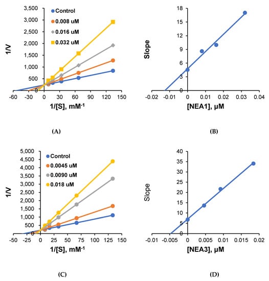 Lineweaver–Burk plots for MAO-B inhibition by NEA1 and NEA3 (A,C), and their respective secondary plots (B,D) of the slopes vs. inhibitor concentrations.