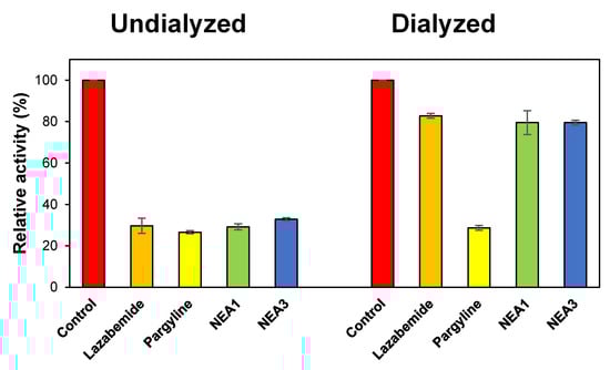 Recoveries of MAO-B inhibitions by NEA1 and NEA3 using dialysis experiments. Dialysis was performed for 6 h with a buffer change after 3 h with duplicate experiments.