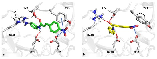 As far as interactions within BACE1 are concerned, the NEA1 compound can make hydrogen bonds with T72 and the catalytic D228 with its enamide moiety. Moreover, the para-nitro substituent can make an ion-dipole interaction with the catalytic D32 and a dipole interaction with Y71 at S1. On the other hand, the enamide moiety of compound NEA3 can establish hydrogen bonds with the catalytic D228 and T72 as reported for NEA1 and, in addition, with R235. Furthermore, the para-nitro group can interact through ion-dipole interaction with catalytic D32. For the sake of completeness, docking scores for NEA1 and NEA3 were equal to 6.656 and 7.191 kcal/mol, respectively.