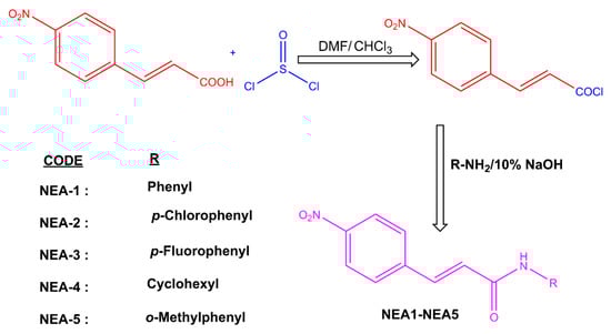 The synthesis of the target molecules is depicted in Scheme 1. Initially, 4-nitrocinnamic acid (5 mmol, i.e., 1.0 g) was added into a 100 mL two-neck flask containing 20 mL of chloroform. Four drops of DMF were added slowly to the flask and stirred for 15 min at room temperature (RT). Thionyl chloride (10 mmol, 2 mL) was added and heated to reflux at 50–60 °C for 5 h. After completion of the reaction, the excess thionyl chloride was distilled off to obtain 4-nitrocinnamoyl chloride as a yellow solid. It was then transferred into a 250 mL flask containing a mixture of respective amines (10 mmol) and 50 mL of 10% NaOH. The reaction was stirred at RT until the completion of the reaction was confirmed by TLC. The final compounds were obtained by recrystallization from hot ethanol.