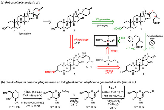 - Potuzak, J.S.; Tan, D.S. Synthesis of C1-Alkyl and Acylglycals from Glycals Using a B-alkyl Suzuki-Miyaura Cross Coupling Approach. Tetrahedron Lett. 2004, 45, 1797–1801. [Google Scholar] [CrossRef]