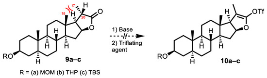Our efforts started with the preparation of the first anchor for the Pd-mediated Suzuki–Miyaura reaction, the steroid core. We initially probed the reactivity of lactone 5 as its C3-protected congeners 9a–c (Scheme 2) in the hope of obtaining enol triflates 10a–c, which would give access to the required coupling partner following our retrosynthetic strategy. Conversion of ketones and lactones to their corresponding enol triflates followed by cross-coupling is a strategic way to access diverse complex natural products in a convergent manner [22]. Despite extensive efforts, lactones 9a–c resisted triflation under common conditions (LiHMDS/KHMDS/LDA then Ph2NTf/Tf2O/Comin’s reagent) [22,23], most likely because of the strong steric hindrance imparted by the C18 and C21 methyl groups restricting the deprotonation at C20. This hypothesis was rationalized when attempts at quenching the supposed enolates with deuterated protic sources (D2O, AcOD) yielded no 2H incorporation at C20.
