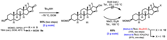 3.2.6. Synthesis of (2aS,4S,6aS,6bS,8aS,8bS,11aS,12aS,12bR)-10-Iodo-4-(methoxymethoxy)-6a,8a,9-trimethyl-2,2a,3,4,5,6,6a,6b,7,8,8a,8b,11a, 12,12a,12b-hexadecahydro-1H-naphtho[2′,1′:4,5]indeno[2,1-b]furan (13)
