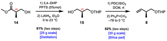 With the anchor of the Pd-mediated cross coupling installed on the steroidal scaffold, we then devised a scalable route to the desired olefin 8. Commercially available (R)-Roche ester 14 was protected as THP followed by reduction using LiAlH4 to yield (S)-monoprotected diol 15 in 81% yield on a 25 g scale after distillation (Scheme 4) [35]. Subsequent oxidation using the Cornforth reagent (PDC) in conjunction with silica gel [36] cleanly yielded the corresponding aldehyde, which was then immediately subjected to a Wittig olefination [37]. The desired olefin 8 was cleanly obtained following a short silica pad in 62% yield after two steps on a 30 g scale.