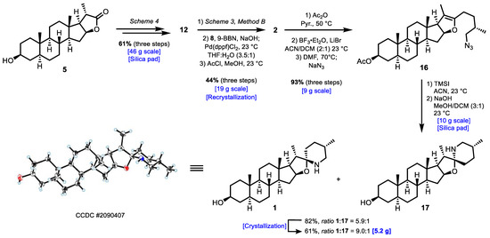 With a large quantity of the desired spiroketal 2 in hand, we applied our previously used successful endgame sequence of transformations with no complications [15]. Compound 2 was acetylated using Ac2O in pyridine and then subjected to Lewis acid-mediated spiroketal opening using BF3·Et2O and LiBr, followed by substitution using NaN3 in DMF to yield the desired azide 16 in 93% yield over three steps (avg. 98%/step) and high purity (>99%) over three steps, requiring no purification. Subsequent reduction of the azide, followed by instant cyclization using TMSI (TMSCl/NaI) delivered the spiroaminoketal moiety, which, after ester hydrolysis (NaOH), produced the natural product 1 in a 5.9:1 ratio with the undesired 5,6-dihydrosolasodine 17. The obtention of 17 as a minor product is a consequent of the unperfect diastereoselectivity in the obtention of 2 and the uncontrolled inversion of the C25 (S→R) during the TMSI-mediated reduction of 16 [40]. Purification by crystallization (vapor diffusion, see Supplementary Materials) generated crystals of tomatidine in a 9.0:1 ratio of 1:17 in 61% yield in two steps from azide 16 on a 10 g scale.
