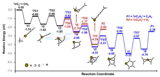 In order to gain insight into the reaction mechanism, the potential energy profiles (PESs) were calculated. All of the three Reactions (1)–(3) leading to the stable structures of the products were exothermic. The pathways for the IrC3+ + CH4 reaction leading to the IrC2H2+/C2H2 and IrC4H2+/H2 products are shown in Figure 2 and details are given in Figures S3–S4. An encounter complex (3I1), that is −1.51 eV lower in energy than the ground state reactants, is formed initially. The Ir atom serves as the active site of the reaction and intermediate 1I2 is formed via the first C–H bond activation. Then, the CH3 moiety is transferred to C3 to form a C–C bond; meanwhile, one H atom is transferred to the Ir atom (1I2 → 1TS2 → 1I3). Subsequently, two hydrogen atoms transfer from the metal Ir atom to the C atom to form two new C–H bonds (1I3 → 1TS3 → 1I4 → 1TS4 → 1I5). The H atom of the CH2 moiety is activated and transferred to the Ir metal (1I5 → 1TS5 → 1I6); then, the H atom migrates from the Ir metal to the C atom which is not coordinated to other H atoms (1I6 → 1TS6 → 1I7). After the CC bond is cleft, the intermediate 2I8 is formed, which involves two equivalent C2H2 moieties—either one can be liberated to form the final product P1 (3IrC2H2+/C2H2). For the pathway for the generation of IrC4H2+/H2, there is the rearrangement steps from 1I3 to form intermediate 1I10 (1I3 → 1TS8 → 1I9 → 1TS9 → 1I10). The final product 1IrC4H2+ is generated with the liberation of H2. Another possible pathway is given in Figure S4.