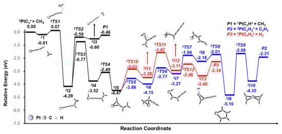 Reaction pathways for generating PtC2H2+/C2H2 (blue trace), PtC4H2+/H2 (red trace) and PtC3H+/CH3 from the reaction of PtC3+ and CH4, calculated at the BMK level. The zero-point vibrational energy-corrected energies (in eV) relative to the entrance channel are given.