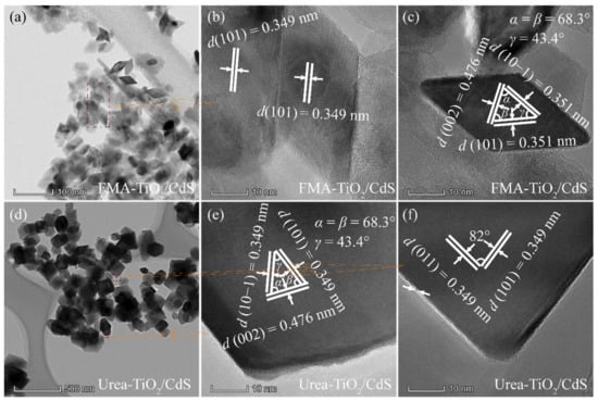 TEM and HRTEM images of (a–c) FMA-TiO2/CdS, and (d–f) Urea-TiO2/CdS samples.