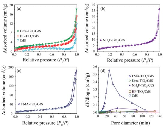 Nitrogen adsorption–desorption isotherms of the as-prepared (a) CdS, HF-TiO2/CdS, Urea-TiO2/CdS, (b) NH4F-TiO2/CdS, and (c) FMA-TiO2/CdS samples, and (d) the corresponding of pore size distribution curves.